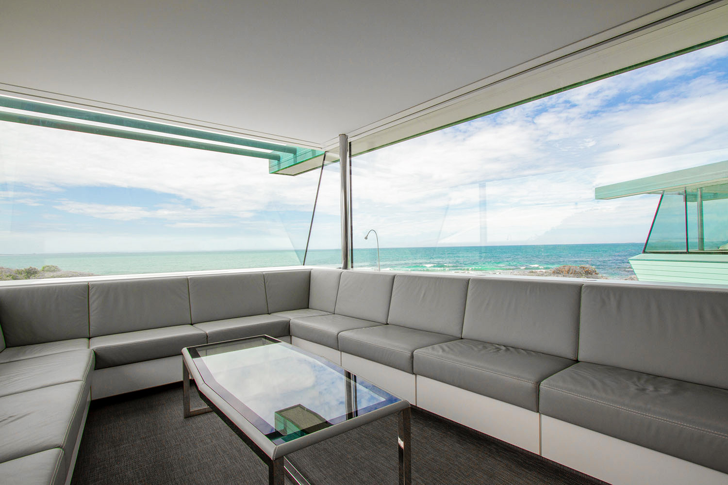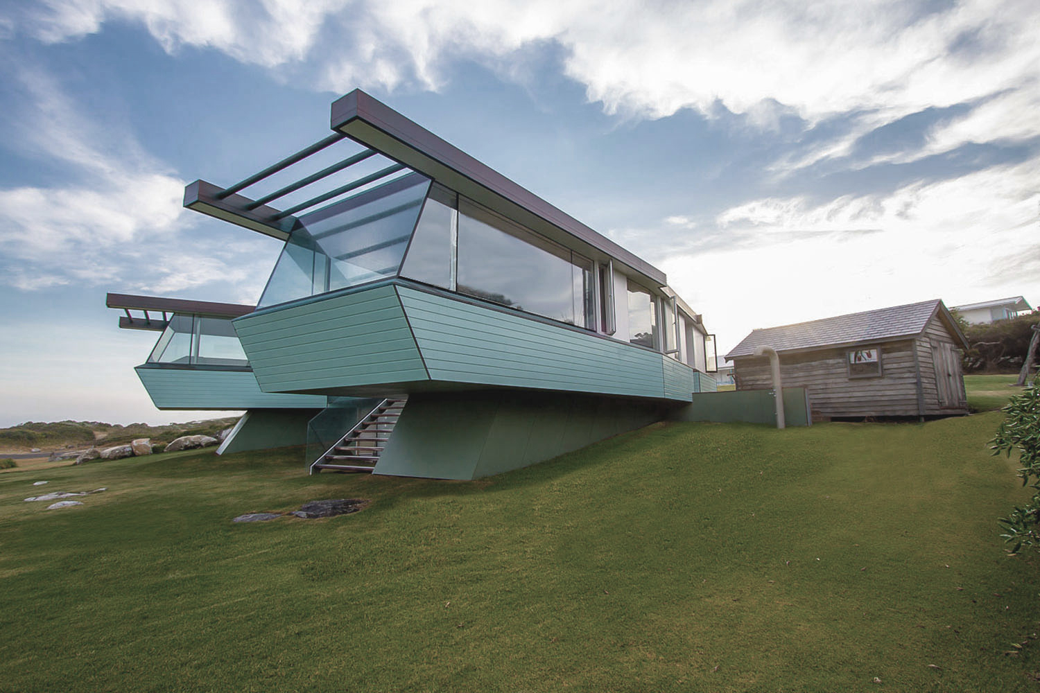 The balcony of the upper floor extends out over the lower floors and commands sweeping views to the ocean. The house uses passive solar principals, with north facing glazing helping to heat the main spaces in the house, and consideration given to achieve excellent cross-flow of air. The roof features a ridge that runs across the building at 45 degrees and folds down to protect the interior from the summer sun.