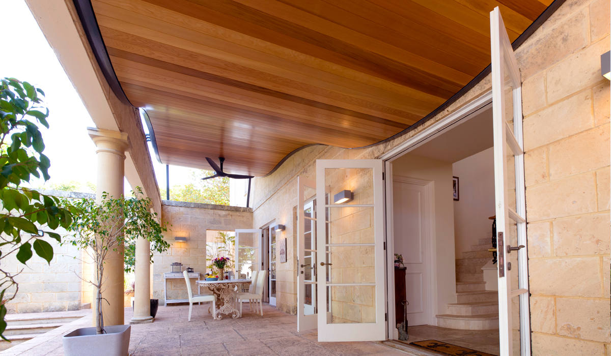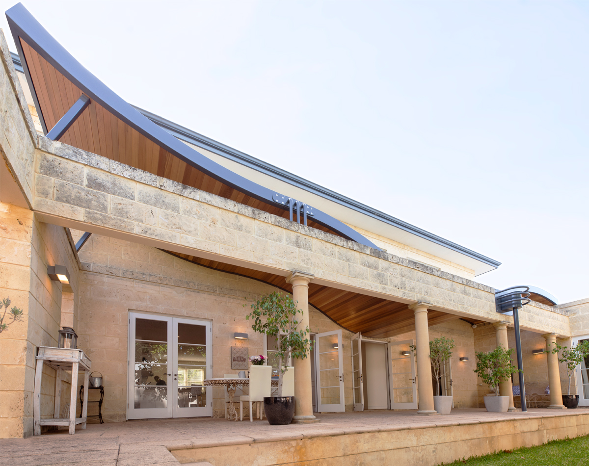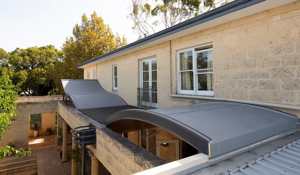 The Goldsmith Veranda is a new addition to an existing two storey limestone family home. The original house was built with a pergola and limestone colonnade on its western façade that provided inadequate sun and weather protection to the interior rooms and an exterior terrace. The new veranda roof, which slips neatly into the existing colonnade, appears to float between the limestone structures. Its fluid form undulates as it curves around existing features, opens to northern light, and closes off against winter rains. e