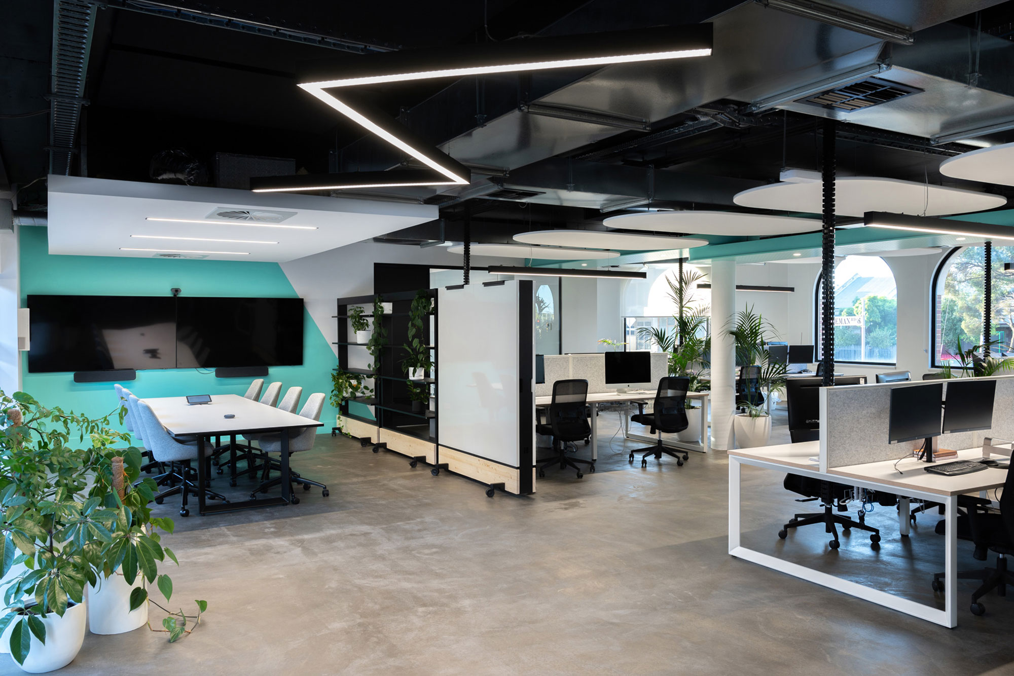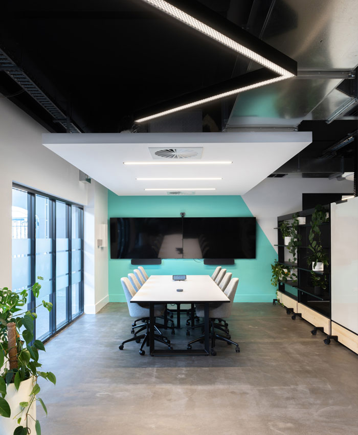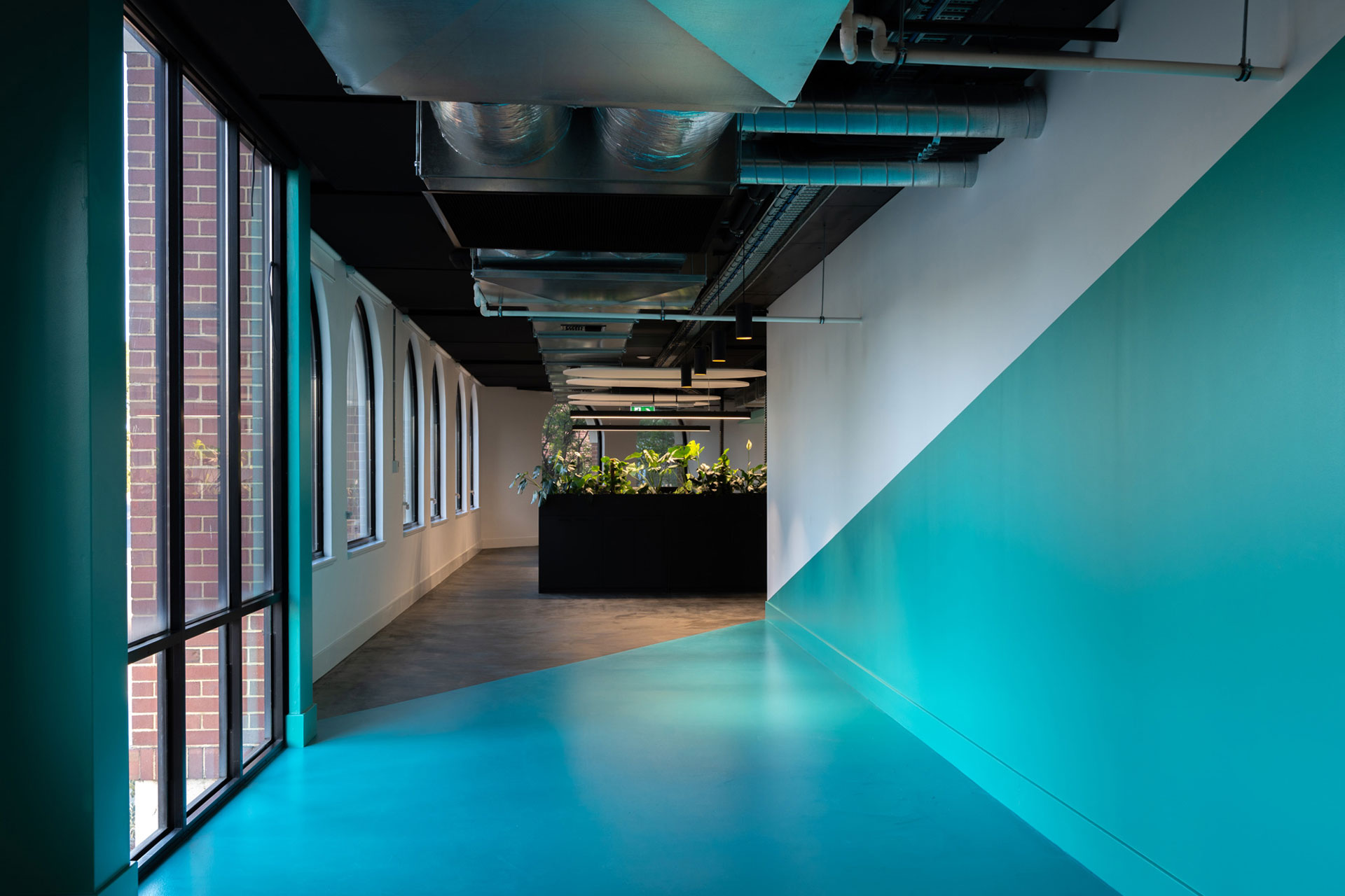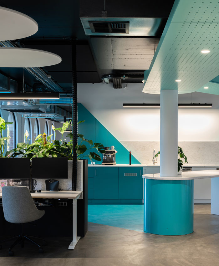 An open plan design promotes flexible and informal interaction. To add definition and break down the scale of the floor plate, a series of green suspended elements tie the office together, forming implied corridors through colour and lighting.