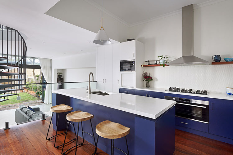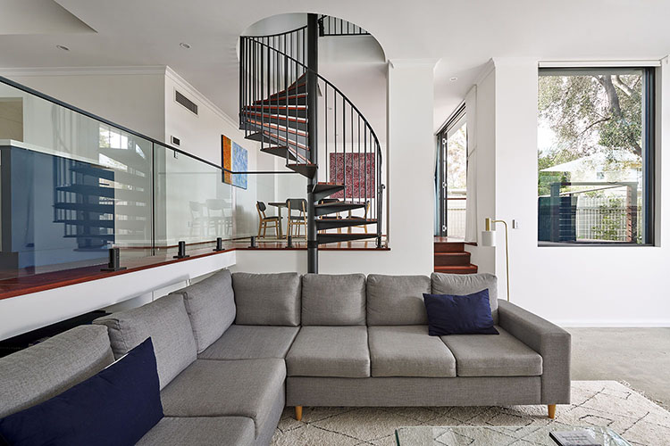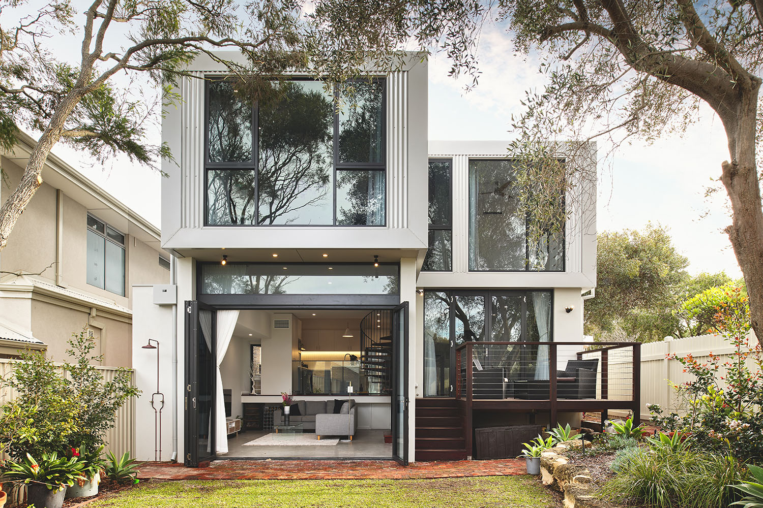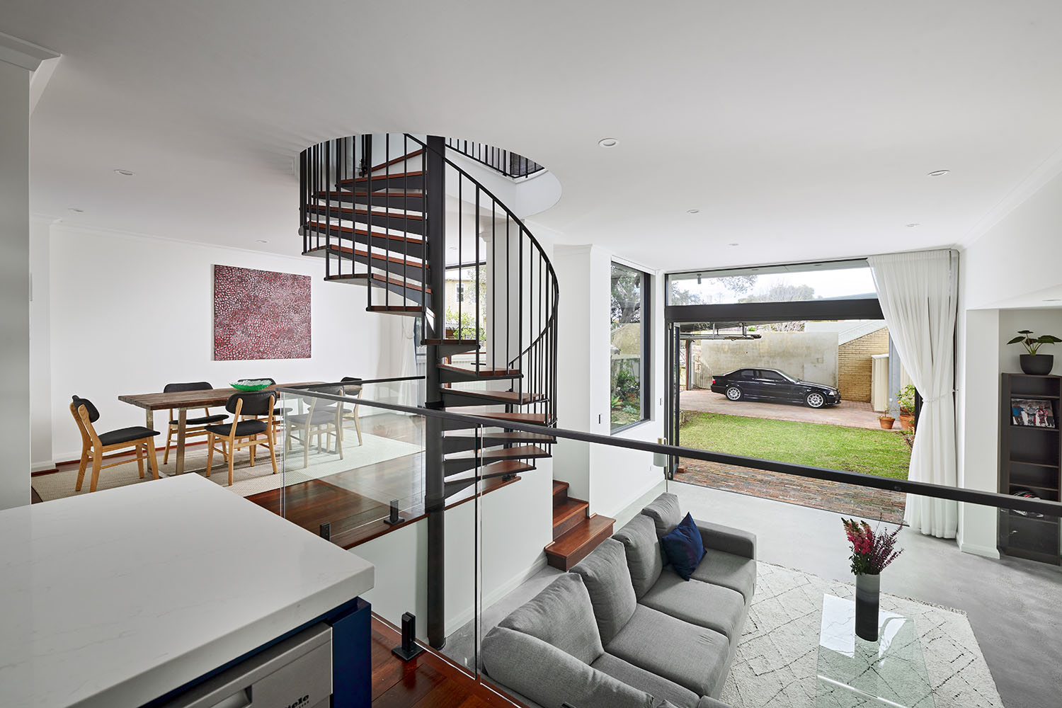 The Swanbourne Residence is a 4 bedroom, 3 bathroom family home with a large yard a double carport and multiple living spaces, shoe-horned into a 400m² lot, and incorporating the restoration of an original 1900s workers cottage. Designed for a growing family, the house provides flexible open living with great connection through to a large lawn, while utilising different heights and spaces to form informal divisions which allow different family activities to occur simultaneously throughout the home.