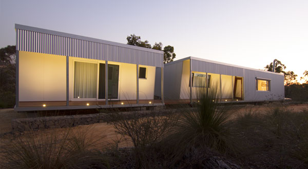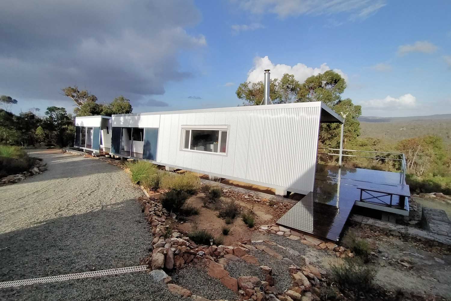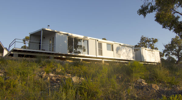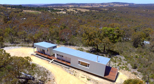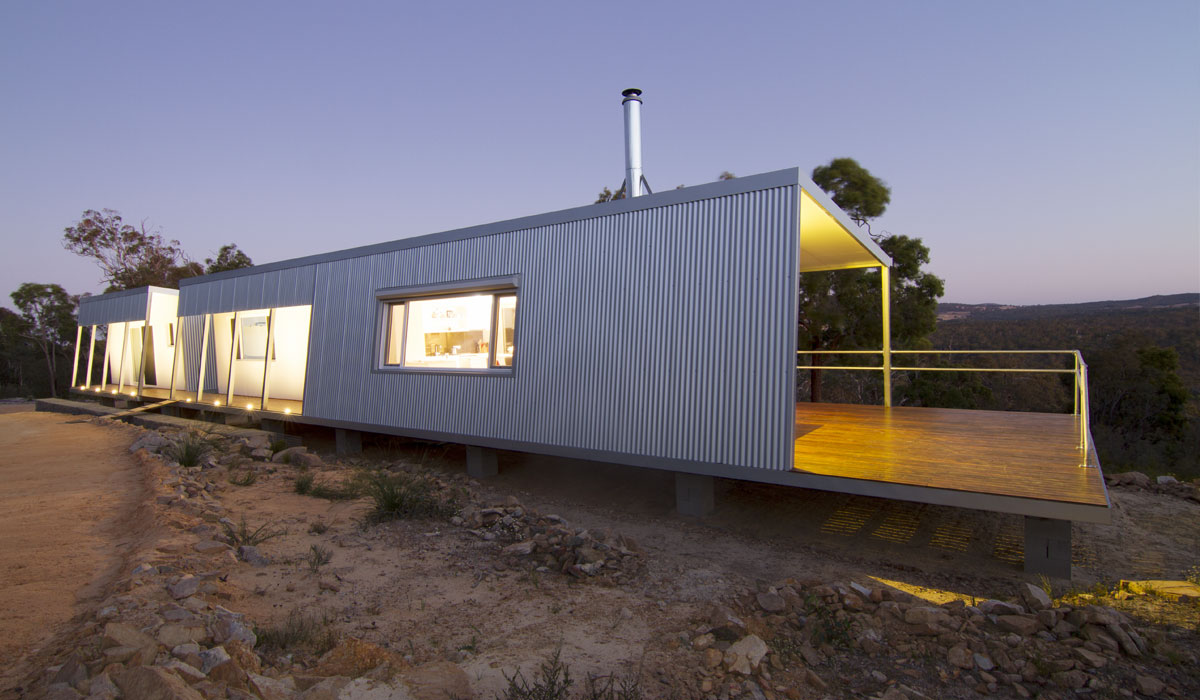 The Toodyay Residence is located on a steep hill of virgin bushland with views over a valley and agricultural fields. The house is designed as 3 transportable units that weree trucked to site and lowered onto concrete block stumps. The building is in an environment that is very prone to bushfire and is likely to be exposed to flames should they rush up the hill. To achieve fire protection the house has been designed to be fully shielded from flames by steel cladding and framing compliant with the stringent bushfire standards and a series of bushfire shutters on the downhill exposure that cover all windows. The house is designed to BAL29 of Australian Standard AS3959-2009 Construction of buildings in bushfire prone areas