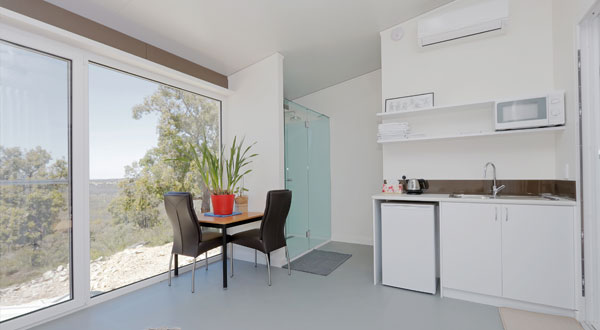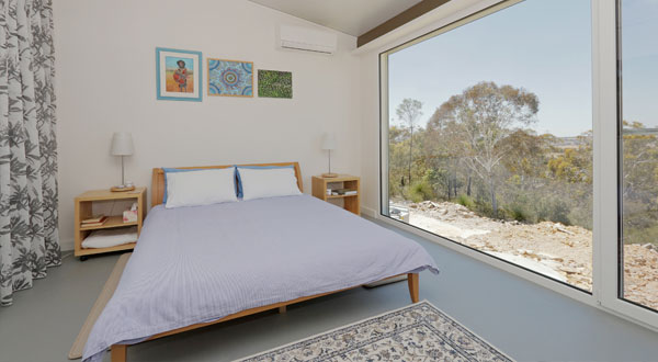 The house was designed in a "studio apartment" arrangement with open spaces and clear connection between the master bedroom and the main living areas. This component is constructed in two modules, while a third module that comprises a semi self-contained guest suite is connected via a bridge. Each room is provided with sweeping views over the Toodyay valley through full height windows that have full height operable openings. The long, slender plan is also perfect for utilising cooling winds being blown up the valley.